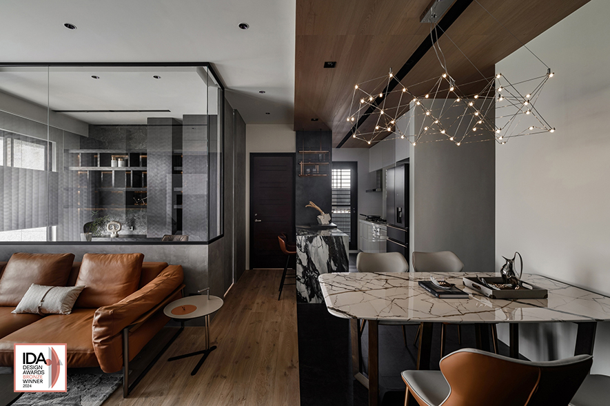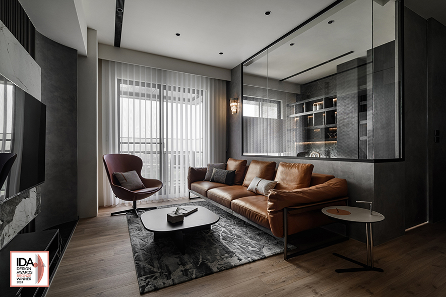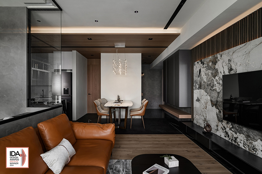 巧妙運用案場的優質地理條件,洆果設計 設計總監 劉笛榛 劃設大面玻璃門窗及清玻隔間牆,搭配公領域的開放式設計,讓戶外河岸景觀自在淌入屋中所有角落,造就廣納天地為生活美景的開闊舒愜宅,作品《潤墨輕光》的澎湃意境驚豔一眾評審,獲頒本屆賽事「Bronze」出色佳績,令細膩獨到的品牌美學再次閃耀國際!
